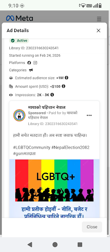 The photo you are seeing above is from the Facebook Ads Library, where an ad is promoting the LGBTQ+ movement in Nepal through a paid Facebook ad campaign. In this campaign, they are demanding that LGBTQ+ people also have the right to vote. This ad was run when the date for parliamentary voting was set on 5 March 2026. As of now, I am documenting this on March 29, 2026, with the current Prime Minister being Mr. Balendra Shah.